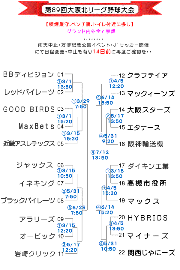2026年・試合日程表・三月~七月・第41回総当たり戦第89回トーナメント大会万博スポーツ広場大阪北リーグ野…
