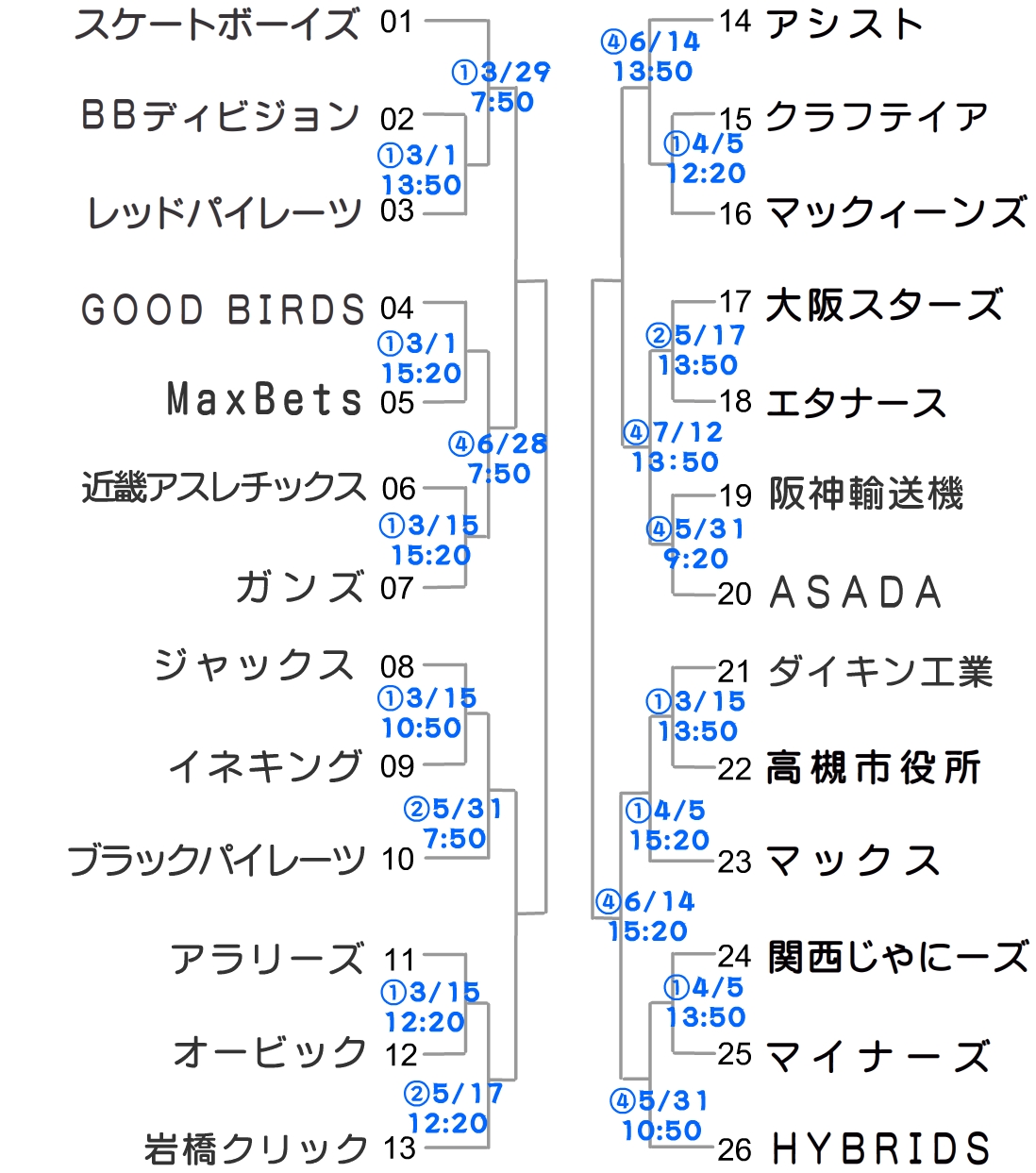 2026年・試合日程表・三月~七月・第41回総当たり戦第89回トーナメント大会万博スポーツ広場大阪北リーグ野…